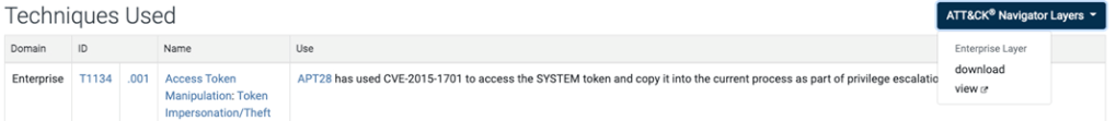 To get started, lets scroll down to the section labeled “Techniques Used” under the APT28 information page. At the top right of this section, you’ll see a dropdown titled ATT&CK Navigator Layers. Here, you can either view or download the ATT&CK Navigator Layer. In our case, we’ll view it to save ourselves the hassle of recreating it.