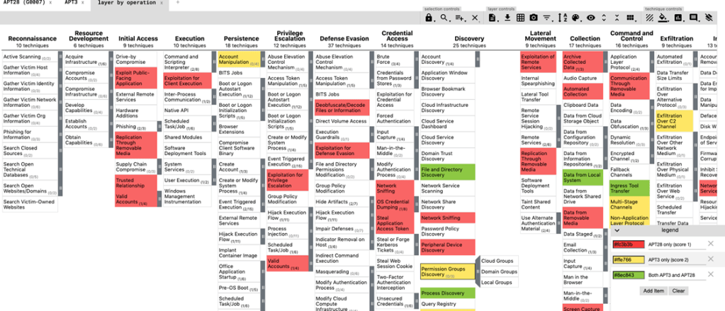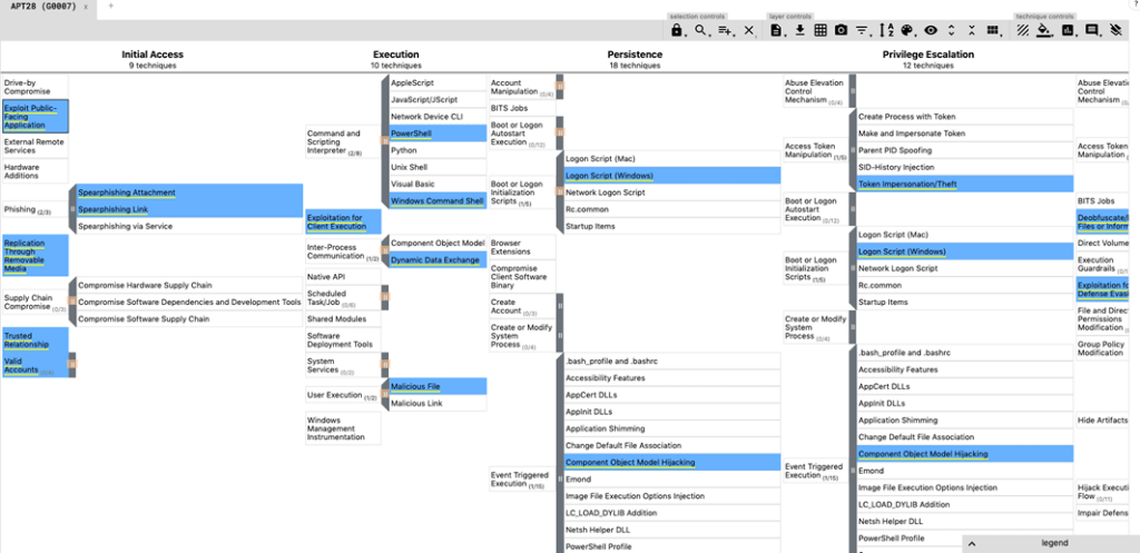 Clicking “view” will open the TTP heat map for APT28 in a new browser tab. Here, you can track known TTPs of the group all the way through their life cycle, spanning from Initial Access all the way to Exfiltration and even Impact.